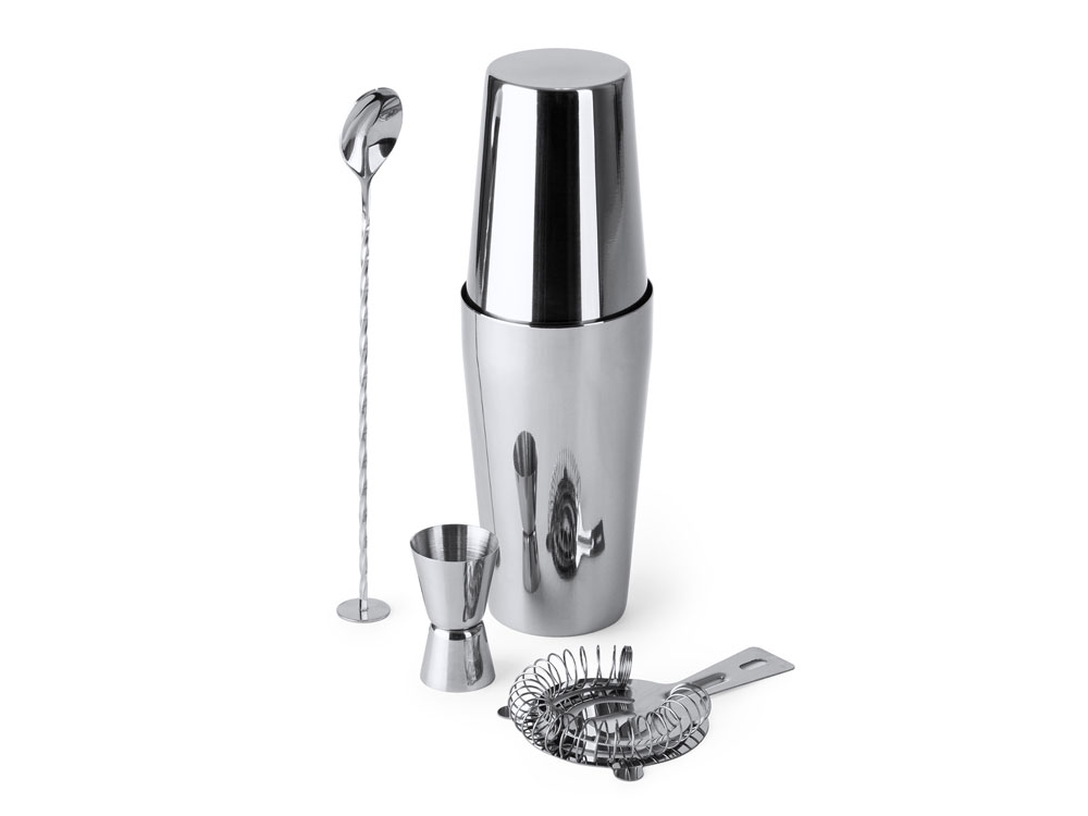 Набор для коктейлей из нержавеющей стали 304. Включает мерный стакан, шейкер на 580 мл, ситечко и ложку. Чехол для транспортировки в комплекте.