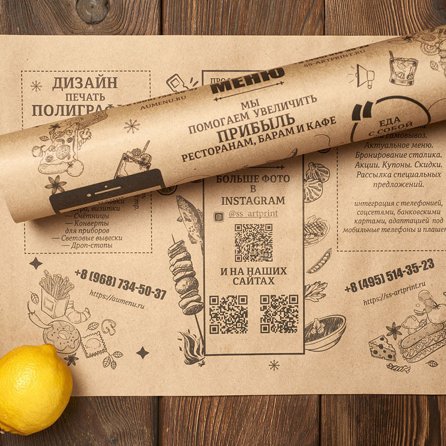 Чтобы подчеркнуть экологичность ресторана, упаковочные листы с логотипом, либо подложки под тарелки на стол обычно печатают на крафт бумаге. Крафт-бумага производится из натуральной древесины и может перерабатываться вторично. Поэтому плейсметы из крафта безопасны для ваших гостей и окружающей среды.